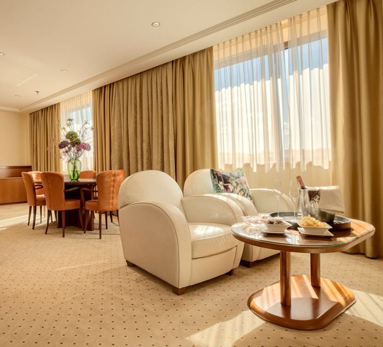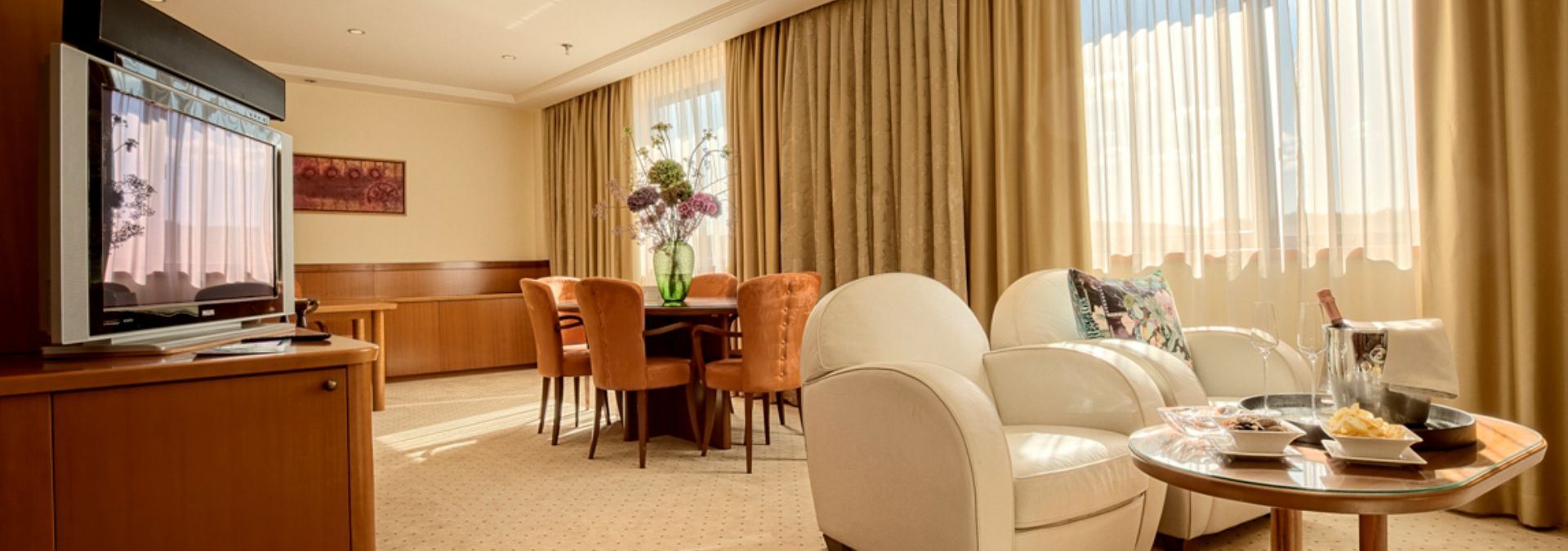 La lussuosa suite Lux offre il massimo confort e intimità. L’area notte è dotata di un ampio letto matrimoniale o di 2 letti separati, mentre il bagno è fornito di vasca idromassaggio, lussuosi accessori da bagno, doccia, bidet e un secondo WC separato. La ampia zona giorno dispone di divano, poltrone, grande tavolo da cucina e di una zona lavoro. L’ospite ha a disposizione il Wi-Fi gratuito, l’accesso gratuito al complesso di piscine e al fitness, oltre al parcheggio gratuito in garage. Il prezzo include una ricca prima colazione a buffet, mentre il servizio in camera è disponibile 24 ore su 24.