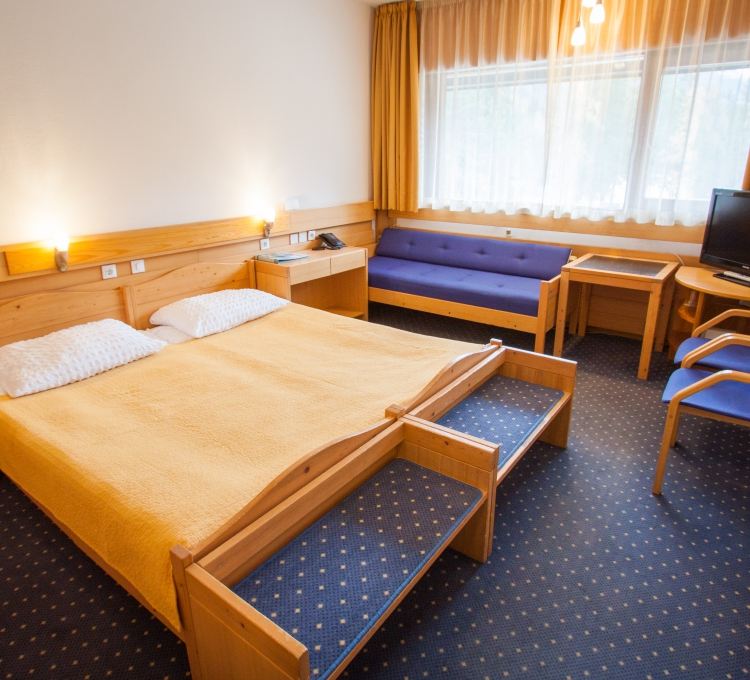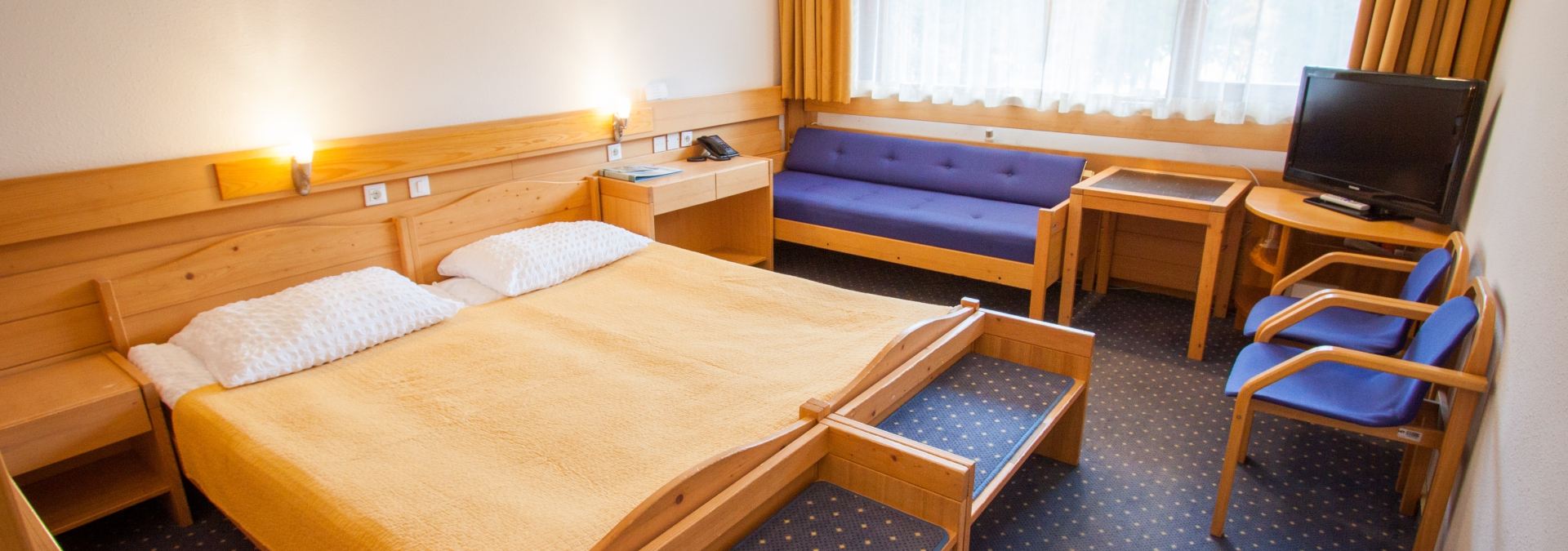 La camera, arredata con due letti singoli, è adatta ad ospitare due persone ed è dotata di doccia, WC, TV, telefono, cassaforte, minibar e accesso a internet. Gli ospiti dell’hotel possono usufruire gratuitamente del complesso di piscine, del centro fitness, del parcheggio adiacente e, durante la stagione turistica invernale, dello ski bus. Sono benvenuti anche gli amici a quattro zampe.